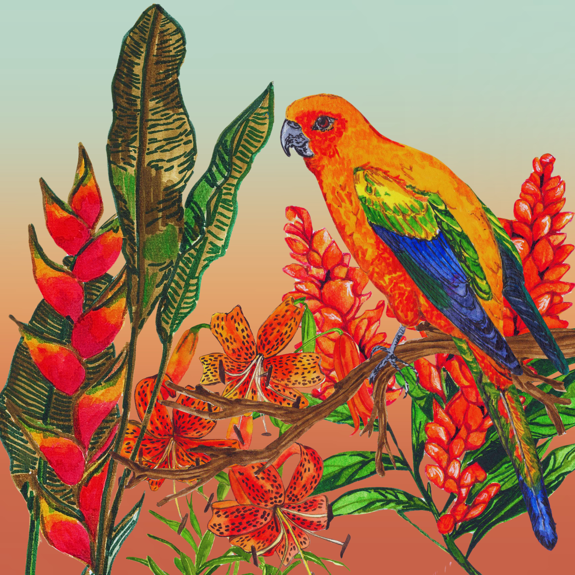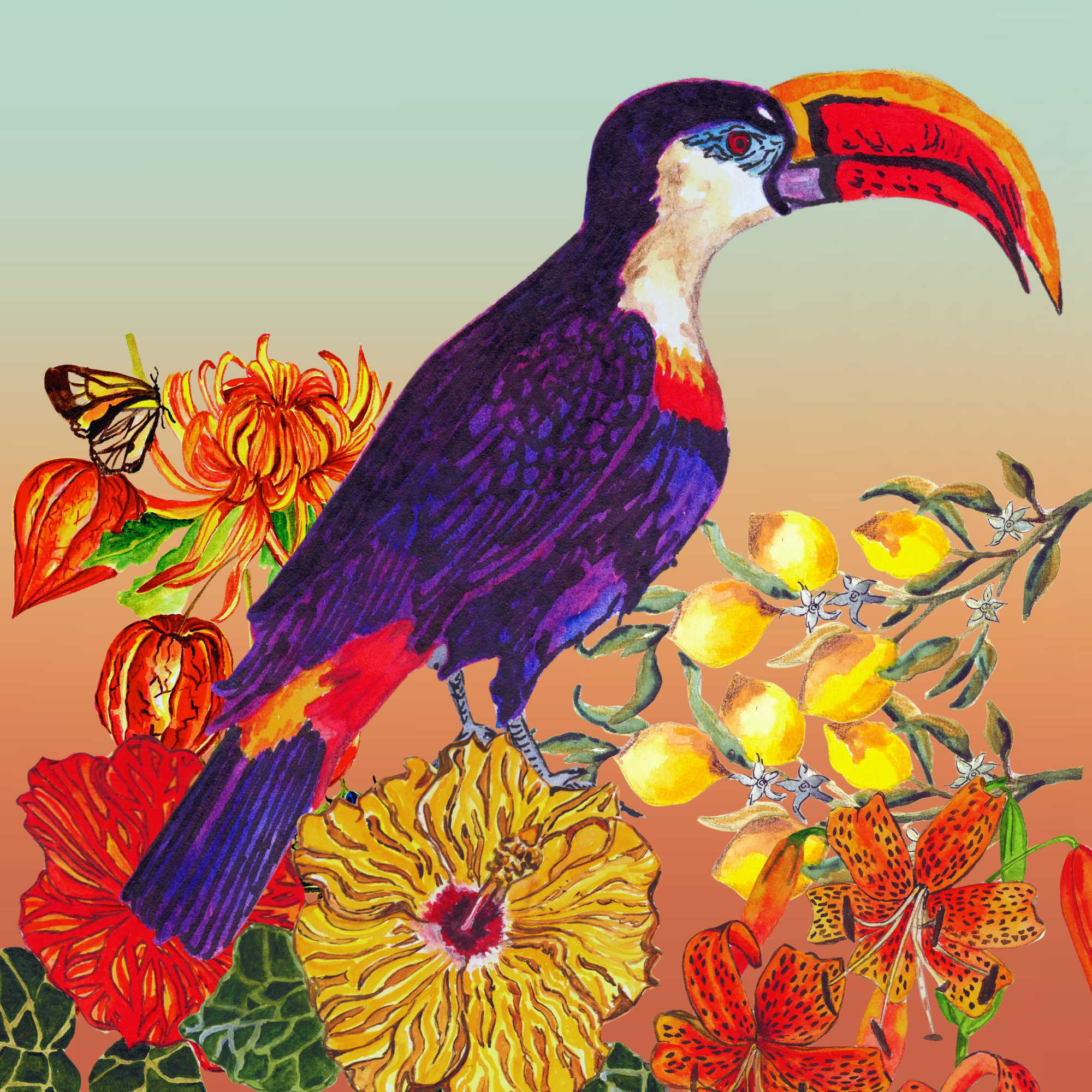 What does paradise look like? To me, it is a vibrant explosion of colour, a breathtaking display of beauty under the radiant sun, teeming with laughter from friends and overflowing with the freshest, most delectable food imaginable. Inspired by the planetary embodiment of this idyllic haven, the two illustrations below showcase the magnificent Channel-billed Toucan and the lively Sun Conure—both proud denizens of South America—nestled among an enchanting array of tiger lilies, ginger lilies, heliconias, hibiscus flowers, zesty lemons, and cheerful chrysanthemums.