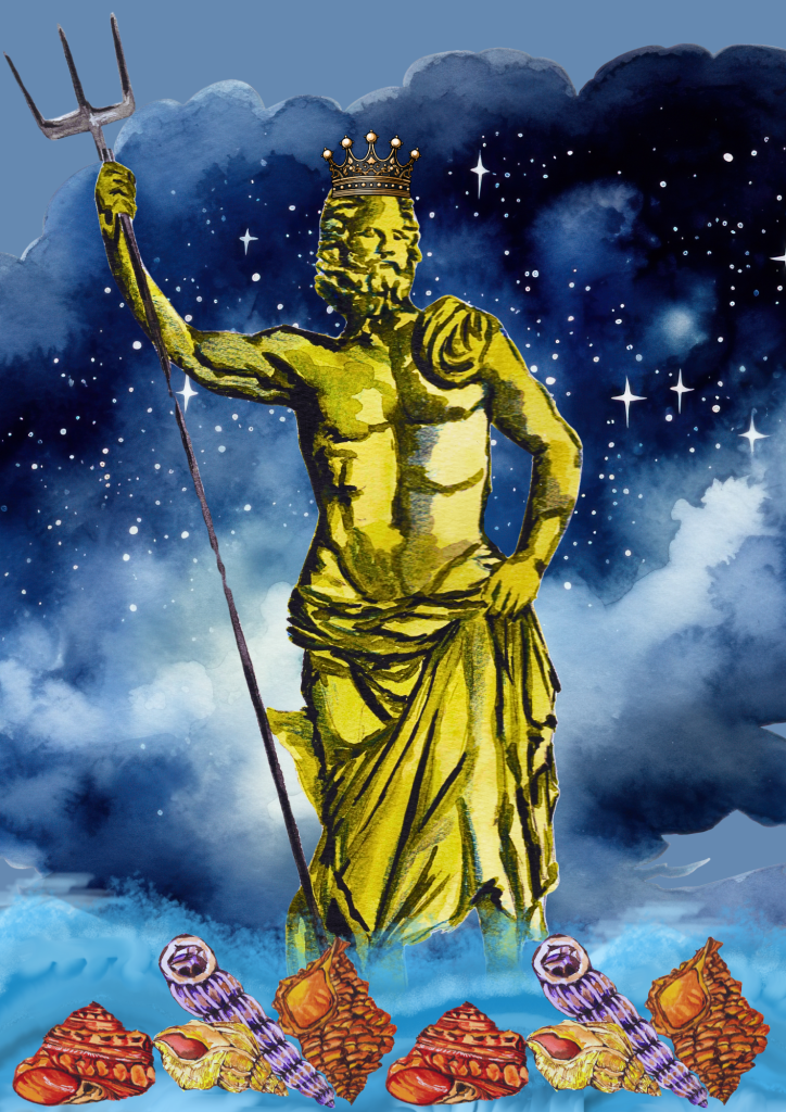 He graces the pages of Homer’s epic masterpieces, The Iliad and The Odyssey, showcasing his grandeur. For this illustration, the enchanting shells are inspired by stunning photographs from a delightful book I discovered in Lyme Regis. If you can spot them, you’ll find a mesmerising mix of wentletrap, waved whelk, turban top, and sting winkle shells, each telling their own captivating story.