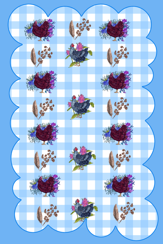 Finally, the Chickens on Blue Gingham design mixes farmhouse tradition with floral whimsy. Speckled hens and deep-toned roosters perch among blossoms and feathers, turning a homely check into something delightfully fresh.