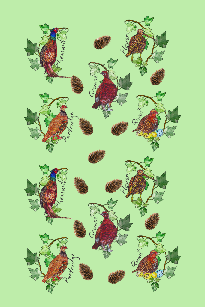 For those who love the outdoors, the Game Birds tea towel bursts with pheasants, grouse, partridges, plovers and quail, framed by ivy leaves and pinecones – a rustic design that feels like a countryside ramble captured in cloth.